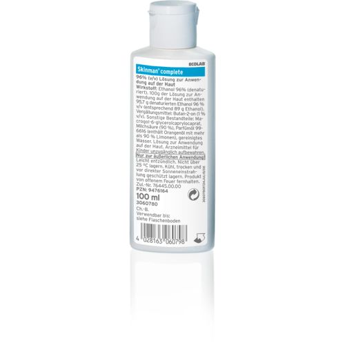 Warnhinweise: SkinmanTM complete ist leicht entzu¨ndlich (Brand- und Explosionsgefahr). Nach Verschu¨tten von größerer Menge des Desinfektionsmittels sind sofort folgende Maßnahmen zu treffen: Aufnehmen der Flu¨ssigkeit, Verdu¨nnen mit viel Wasser, Lu¨ften des Raumes sowie das Beseitigen von Zu¨ndquellen. Produkt von offenem Feuer fernhalten. Vor Anwendung elektrischer Geräte Produkt antrocknen lassen. Vorsicht bei Anwendung von SkinmanTM complete bei alkoholempfindlichen Oberflächen. SkinmanTM complete ist augen- und schleimhautreizend. Nicht in der Nähe der Augen, auf verletzter Haut oder auf Schleimhäuten anwenden. Bei unbeabsichtigtem Kontakt mit den Augen oder Schleimhäuten sofort mit viel Wasser zu spu¨len (im Falle der Augen auch unter den Augenlidern). Bei anhaltender Reizung einen Arzt aufsuchen. Nur zur äußerlichen Anwendung. Bei versehentlicher Einnahme unverzu¨glich ärztlichen Rat einholen.