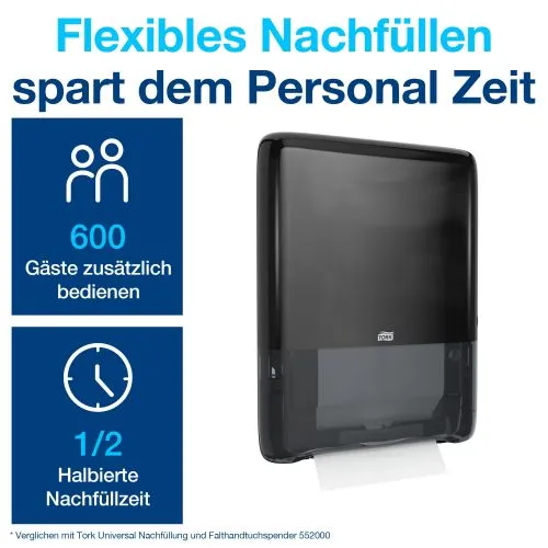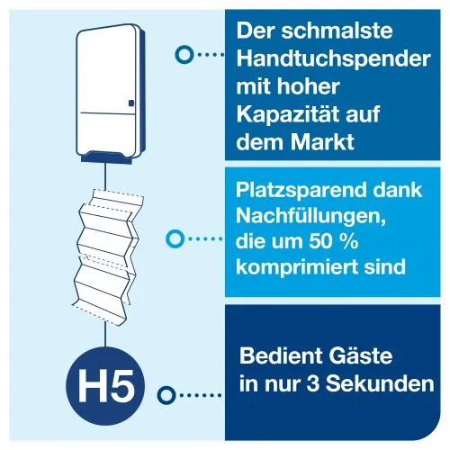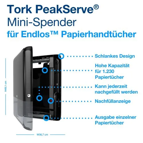 Tork PeakServe: die neueste Innovation für hochfrequentierte Waschräume, in denen das Reinigungspersonal mehr Reinigungsaufwand hat und für einen reibungslosen Besucherdurchlauf sorgen muss. Kompatibel mit dem Tork PeakServe® Endlos-Handtuchsystem. Das System verfügt über eine sehr hohe Kapazität von 1.230 Handtüchern, die schnell und ohne Unterbrechung ausgegeben werden und so einen schnellen und reibungslosen Besucherstrom ermöglichen. Die komprimierten Nachfüllungen sind schnell einzulegen, können jederzeit aufgefüllt werden und sind einfach und bequem zu transportieren und zu lagern – damit sich Ihr Personal ganz auf das Reinigen konzentrieren kann.