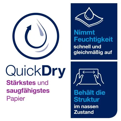 * QuickDry – unser stärkstes und saugfähigstes Papier, das ein effizienteres Abtrocknen bei geringerer Abfallmengeermöglicht