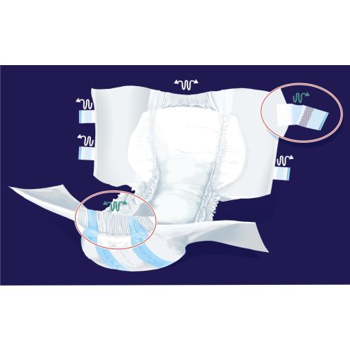 * einzigartige doppelte Klebeklettverschlüsse - ermöglichen mehrmaliges Öffnen und Schließen der Windel, ohne die Außenschicht zu beschädigen